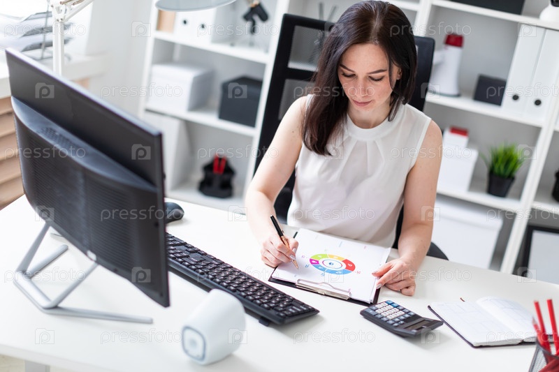 Молодая девушка сидит в офисе за компьютерным столом и работает с документами