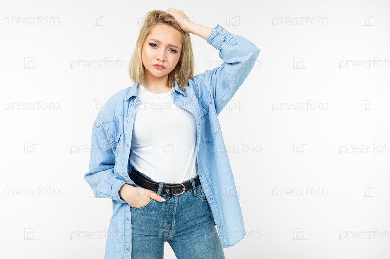 Портрет уверенной в себе девушки со светлой прической в повседневном стиле на белом изолированном фоне