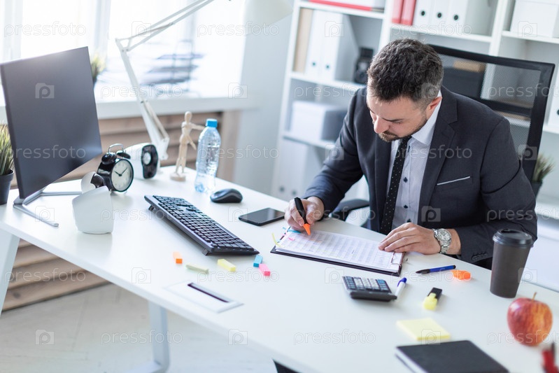 Бородатый мужчина в деловом костюме работает в светлом офисе. фото с глубиной резкости