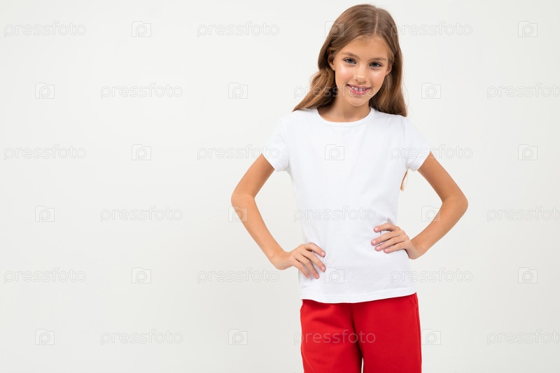 Кавказская девушка-подросток в черной куртке, белой рубашке и красных штанах улыбается на белом фоне