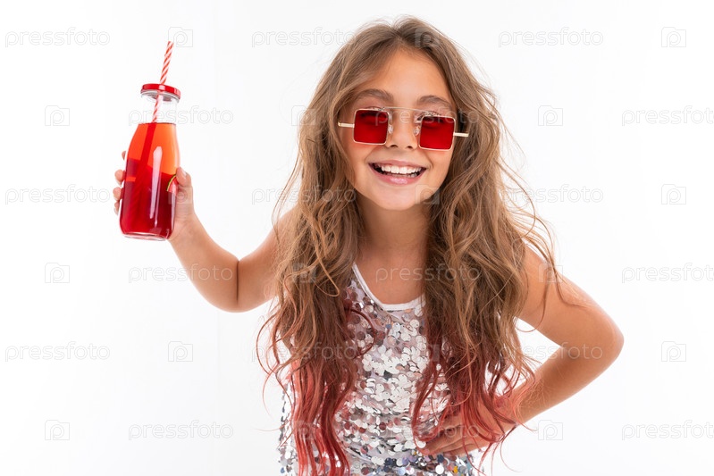 Смешная маленькая девочка держит одну руку на талии и коктейль в другой руке