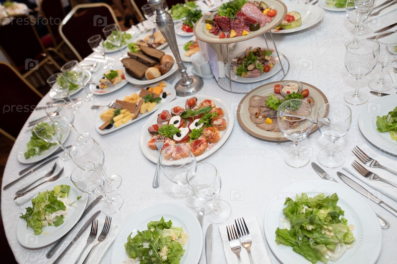 Праздничный стол с разнообразными блюдами, закусками, напитками