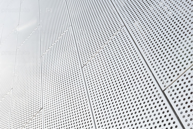 Металлические решетки с множеством круглых отверстий на фоне потолка. Точечный рисунок на поверхности, вид по диагонали