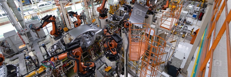 Сварка кузова автомобиля. Линия по производству автомобилей. длинный формат. Широкая рамка