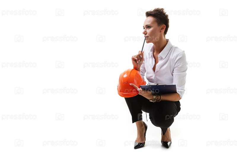 Красивая кавказская женщина в офисной одежде думает о работе, пишет заметки и держит оранжевый строительный шлем на белом фоне