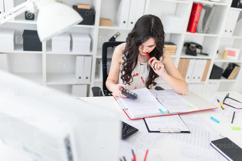 Красивая молодая девушка сидит за офисным столом, держа ручку во рту и глядя в калькулятор
