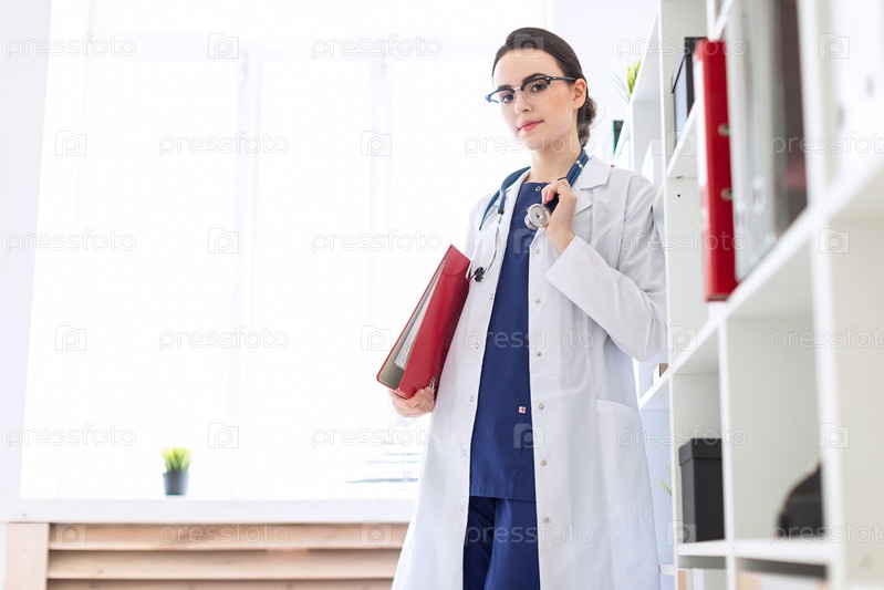 Красивая молодая девушка в белом халате стоит возле приюта и держит под мышкой красную папку
