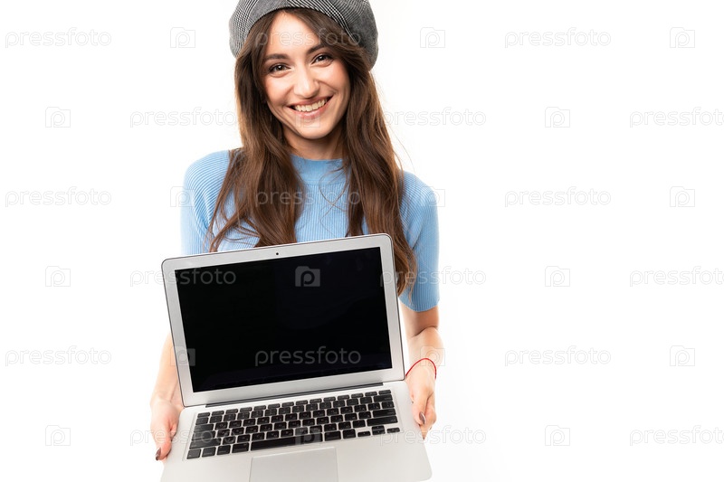 Европейская девушка с открытым ноутбуком с макетом на белом фоне