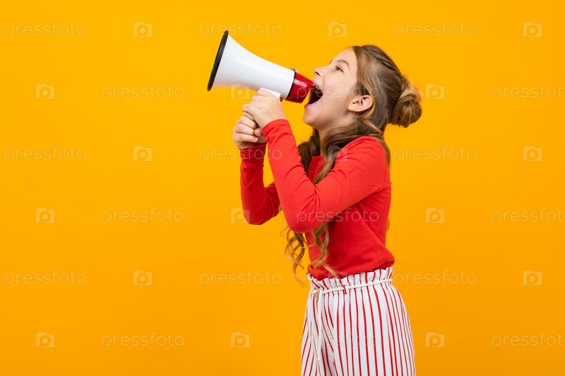Европейская девочка-подросток кричит новости в громкоговоритель и стоит боком на желтом студийном фоне с копировальным пространством