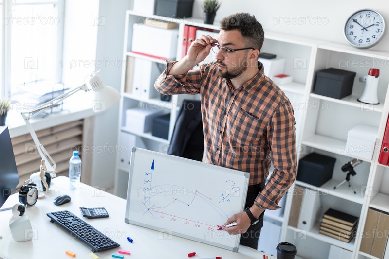 Бородатый мужчина в клетчатой рубашке, очках и темных брюках работает в светлом офисе. фото с глубиной резкости