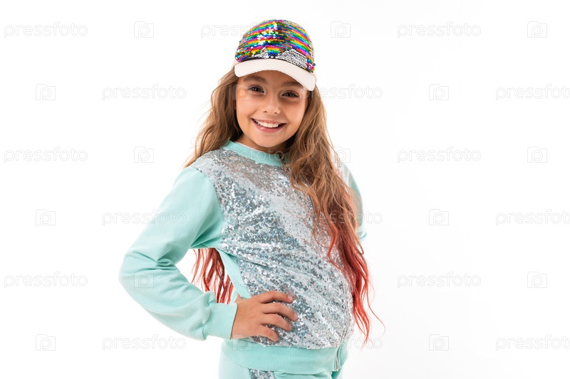 Маленькая красивая кавказская девушка с длинными волнистыми каштановыми волосами и милой улыбкой в спортивном костюме и кепке улыбается