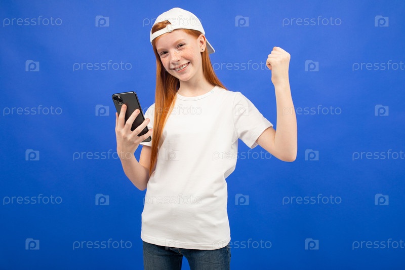 Удивленная рыжеволосая девушка-подросток в белой футболке с гаджетом для общения в руках на синем фоне студии