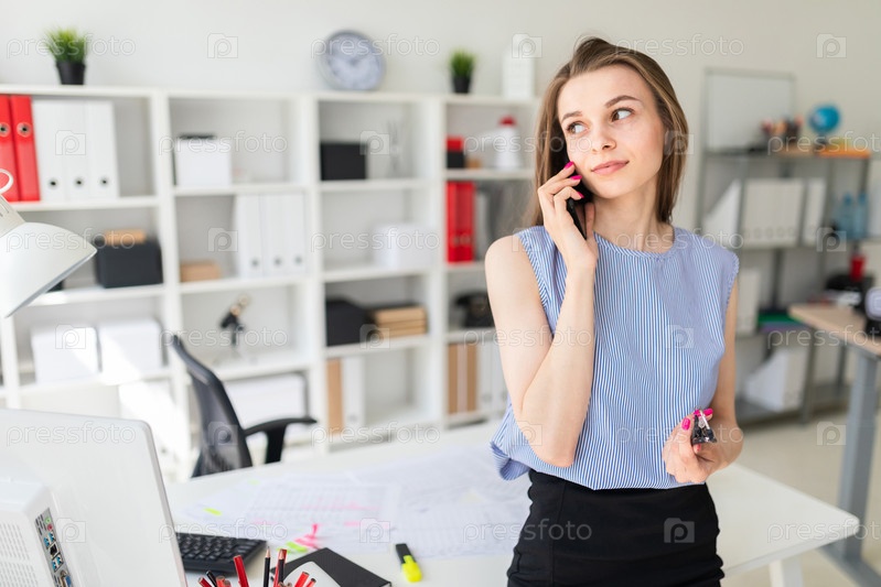 Очаровательная молодая девушка в черной юбке и синей блузке работает в ярком офисе. фото с глубиной резкости