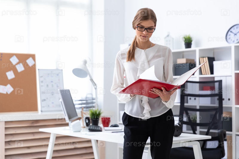 Красивая молодая девушка со светлыми волосами. В офисе работает девушка в белой блузке и черных брюках. фото с глубиной резкости
