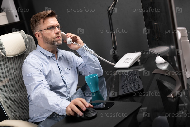 Представительный мужчина с волосами на лице в серой рубашке и джинсах работает в современном офисе за компьютером. бизнесмен отвечает на звонок по стационарному телефону. Портрет предпринимателя за работой в офисе