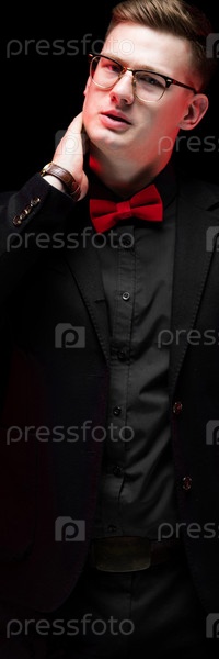 Молодой кавказский элегантный серьезный умный успешный деловой человек в черном костюме с галстуком-бабочкой, стоящий в офисе и смотрящий в сторону грустно разочарованно устал, держа руку на шее