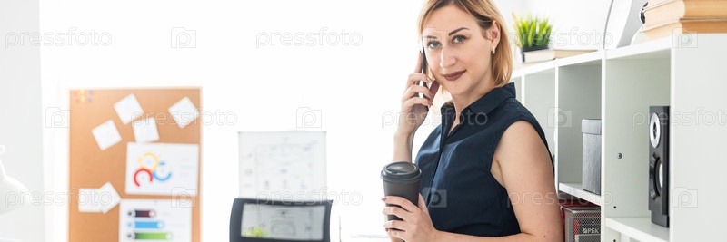 Очаровательная молодая девушка, работающая в ярком офисе. У девушки светлые волосы. На ней черная блузка и желтая юбка. фото с глубиной резкости