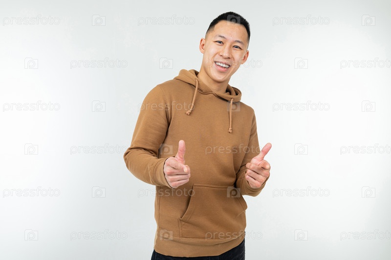 Уверенный в себе азиат в коричневой толстовке с капюшоном показывает руки, как на белом фоне