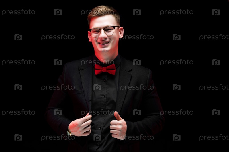 Молодой кавказский элегантный серьезный умный успешный бизнесмен в черном костюме с галстуком-бабочкой, стоящий в офисе и смотрящий в камеру, счастливо улыбающийся с большим пальцем вверх
