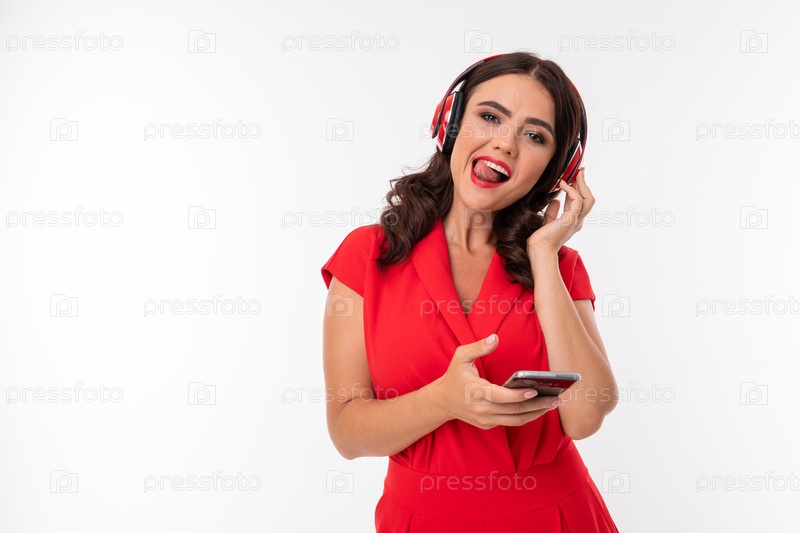 Изображение красивой молодой кавказской женщины с длинными темными волосами и ярким макияжем в красном платье с телефоном на белом фоне