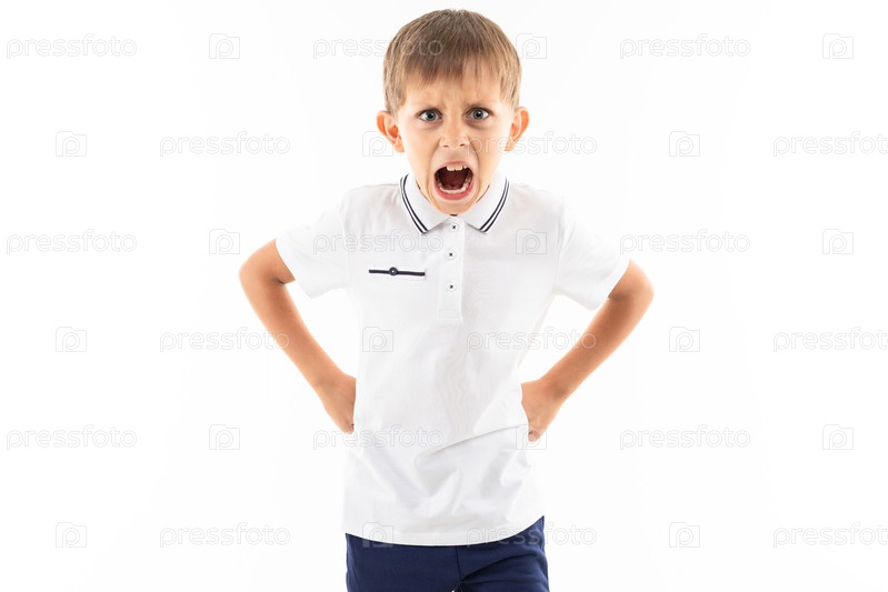 Злой мальчик с челкой в белой футболке на белом фоне с копией пространства