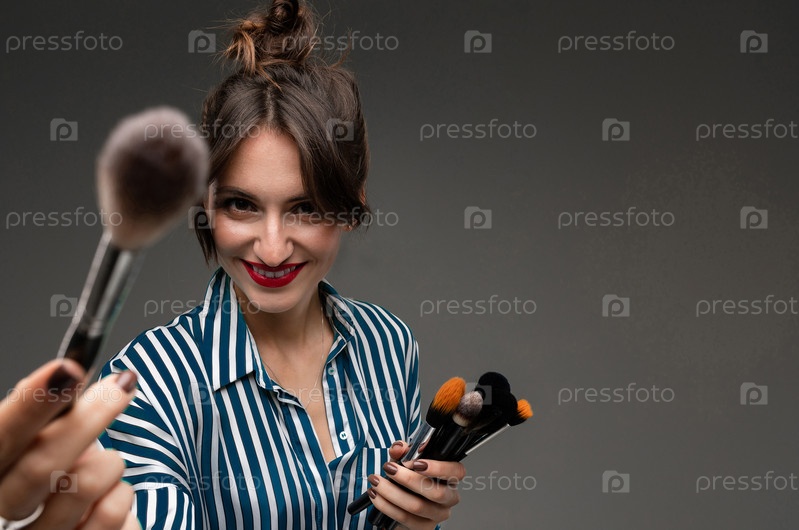 Портрет молодой улыбающейся женщины в сине-белой полосатой блузке с кисточками для макияжа в руках изолирован. Одна кисть расфокусирована. Фото с глубиной резкости