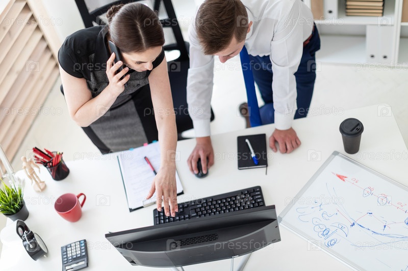 Красивая молодая девушка и молодой человек, работающий в ярком офисе. У них деловая одежда. фото с глубиной резкости