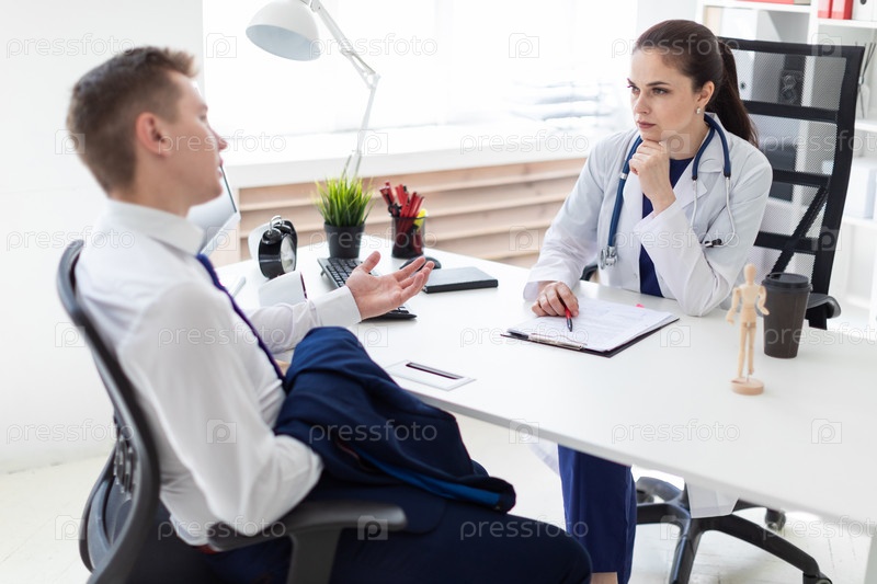 Молодые люди сидят в светлом офисе. Девушка в белом халате и с фонендоскопом на шее. Молодой человек в брюках и рубашке. фото с глубиной резкости