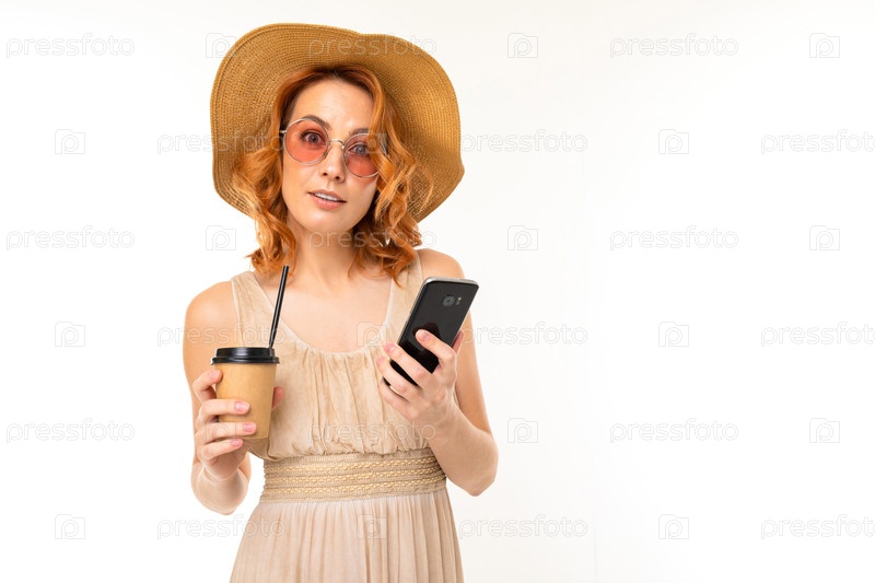 Улыбающаяся кавказская девушка в очках, шляпе и летнем платье со стаканом и телефоном на белом фоне с копией пространства
