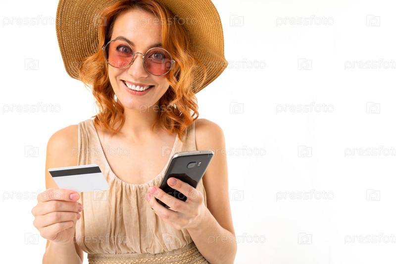 Портрет кавказской женщины со светлыми рыжими волосами, красивым лицом в красивом светлом платье и большой шляпе улыбается и показывает свой телефон с кредитной картой