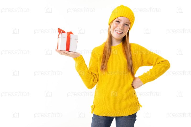 Портрет улыбающейся девушки с подарком в одной руке на белом фоне