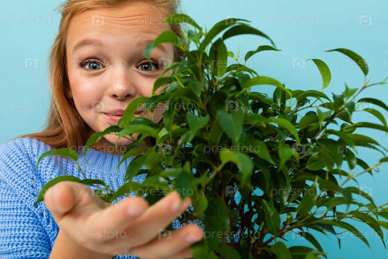 Европейская девушка с растением в руках на голубом фоне