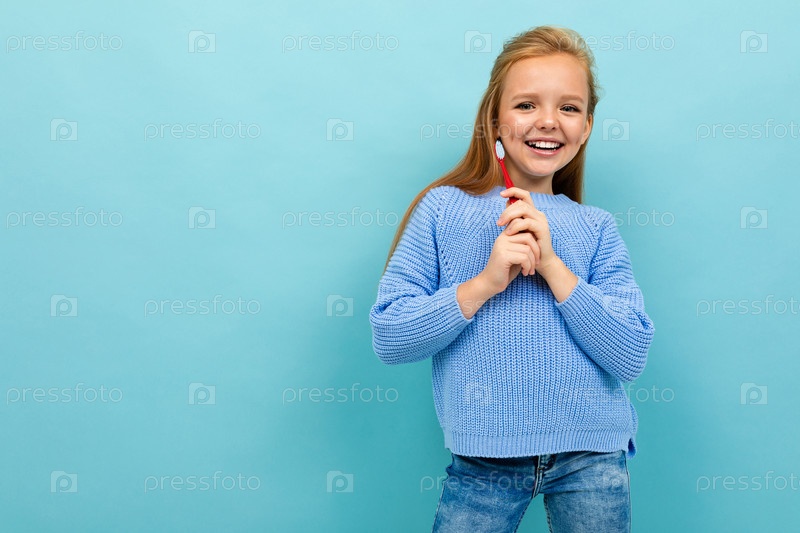 Привлекательная европейская девушка держит в руках зубную щетку на голубом фоне с копирайтом