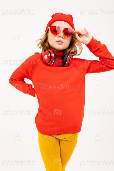Счастливая девочка-подросток с рыжими волосами, красной шляпой и солнцезащитными очками позирует с наушниками на белом фоне