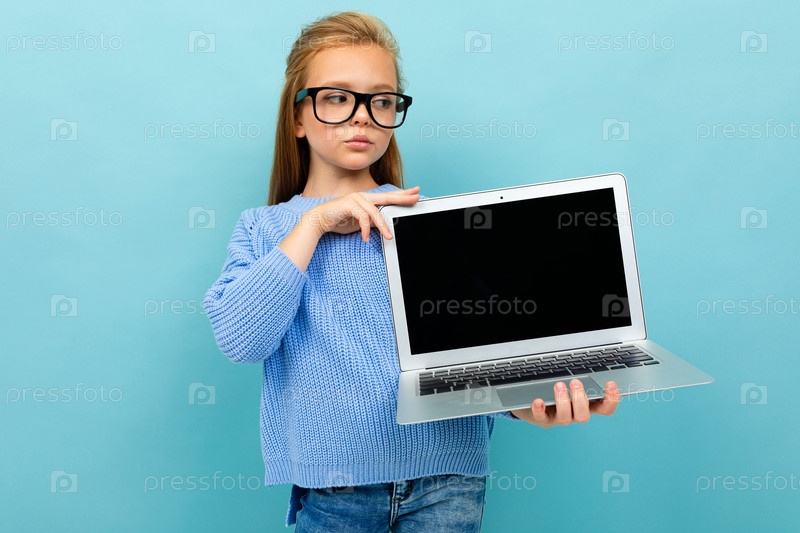 Серьезная европейская девушка держит компьютер в руках с экраном вперед с макетом на голубом фоне