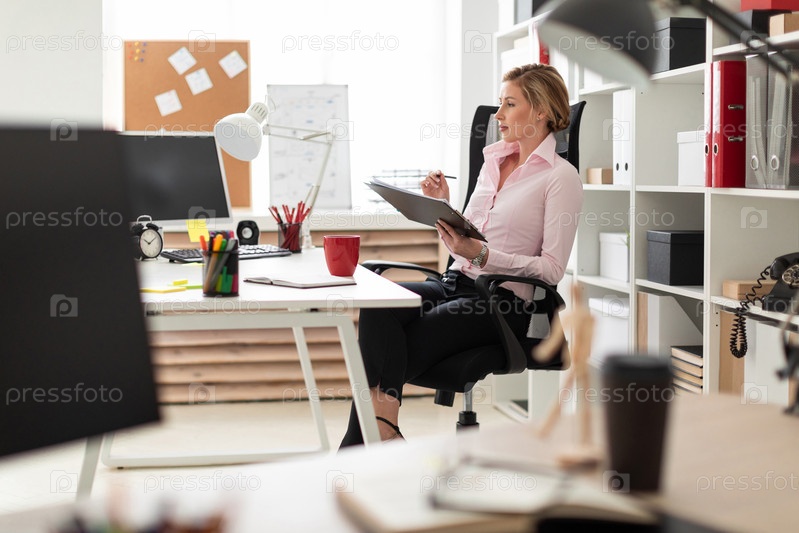 Молодая девушка сидит в кресле в офисе и держит в руках документы и карандаш