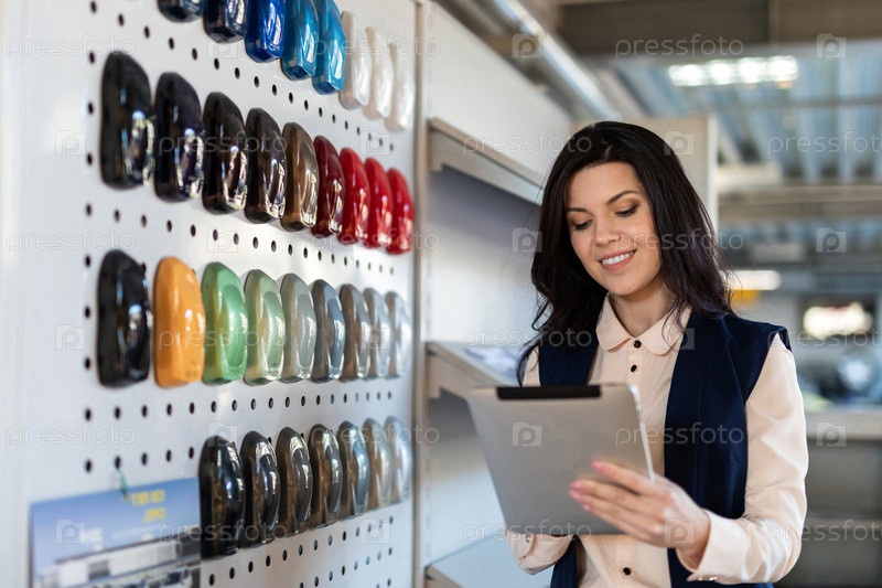 Профессиональный продавец помогает выбрать цвет для автомобиля в дилерском центре