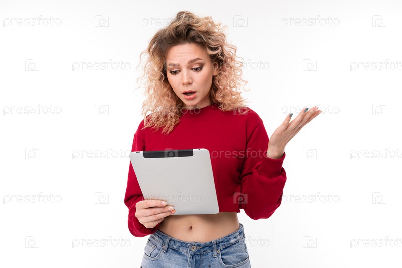 Европейская девушка читает сообщения на планшете на фоне белой студии