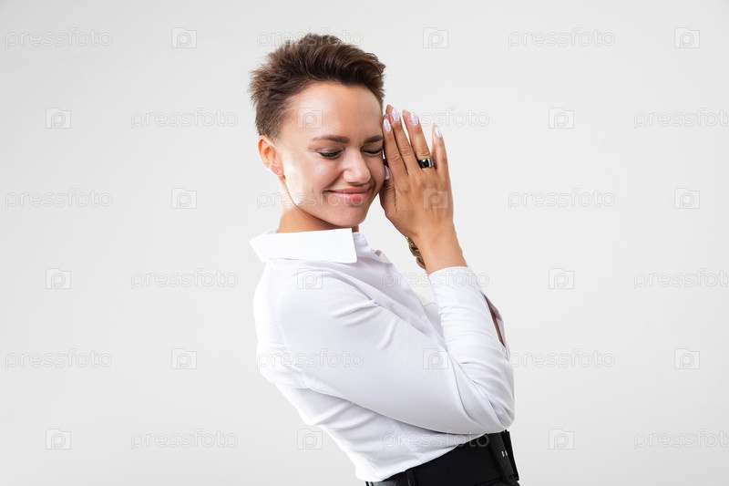Молодая красивая девушка с короткими темными волосами, макияжем в белой рубашке, черных брюках, с наручными часами, браслетом и белым маникюром сложила руки и улыбнулась