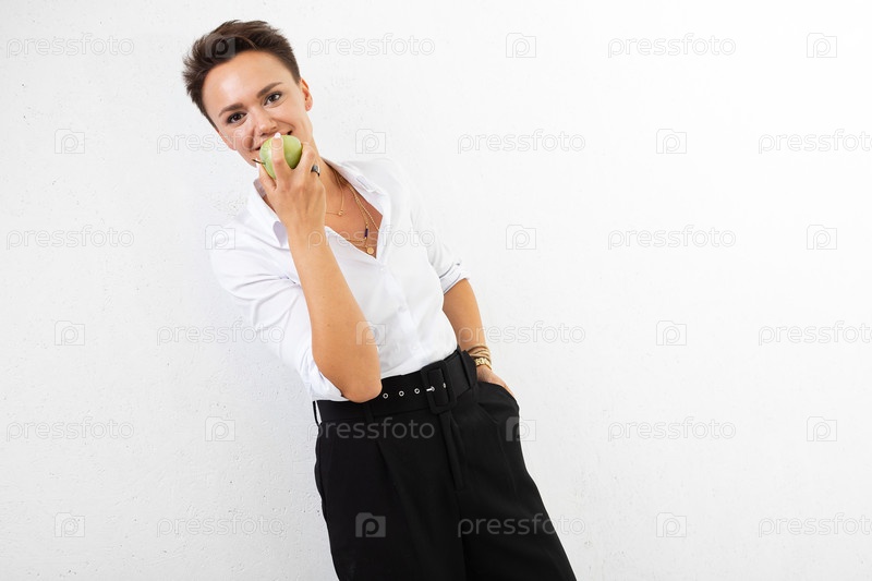 Красивая кавказка в офисной одежде ест зеленое яблоко