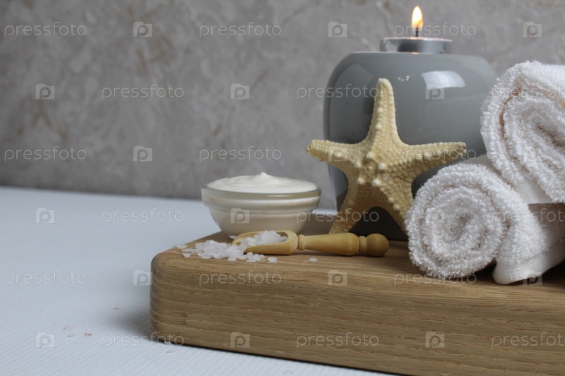 Соль для ванн массаж пилинг спа релакс массаж. Домашний салон по уходу за телом. Красота. Белые полотенца, морская звезда, соленые свечи на деревянном подносе на сером фоне, вид сбоку