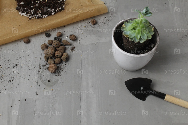 Пересадка растений в домашних условиях. растения в горшке горшок горшок госпиталь песок земля камни на сером фоне с пространством для текста copyspace. благоустройство квартиры дома