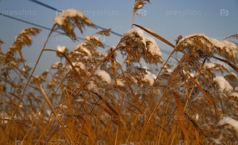 Стебли камыша, покрытые снегом на фоне голубого неба