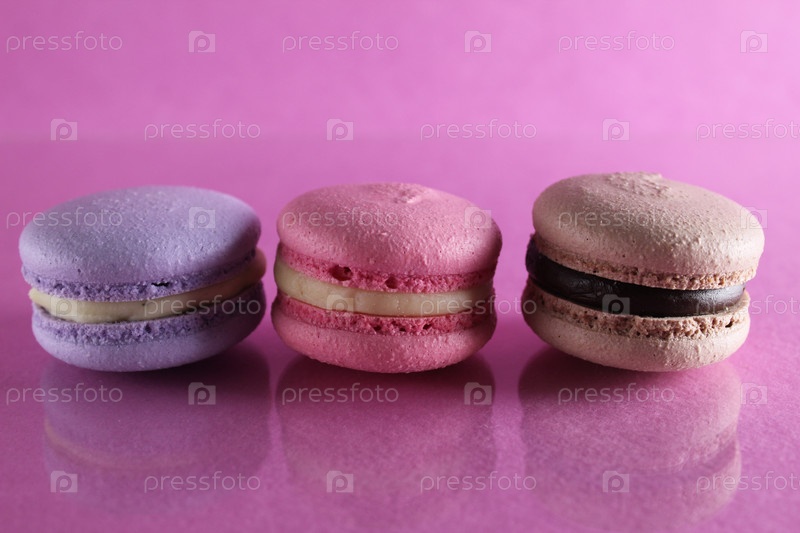 Три макаруна сиренево-коричневого шоколадно-лавандово-розового цвета лежат в ряд на розовом фоне цвета фуксии с отражением и местом для текста и копирайта