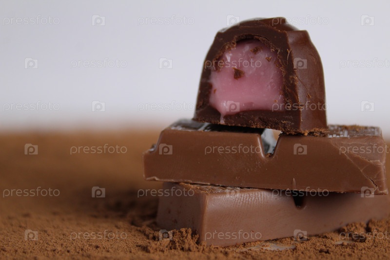 Шоколадные конфеты лежат на шоколаде и какао на белом фоне с местом для текста и копирайта