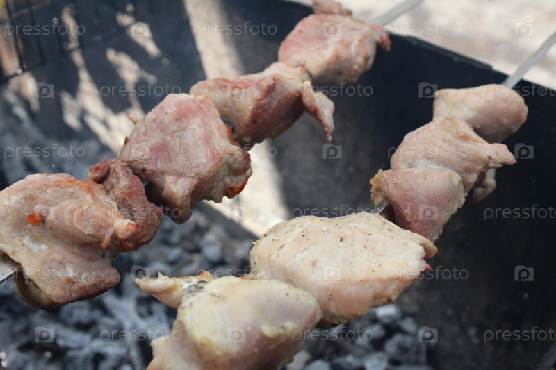 Мясо на гриле или куриный шашлык на гриле, обжаренный на углях летом