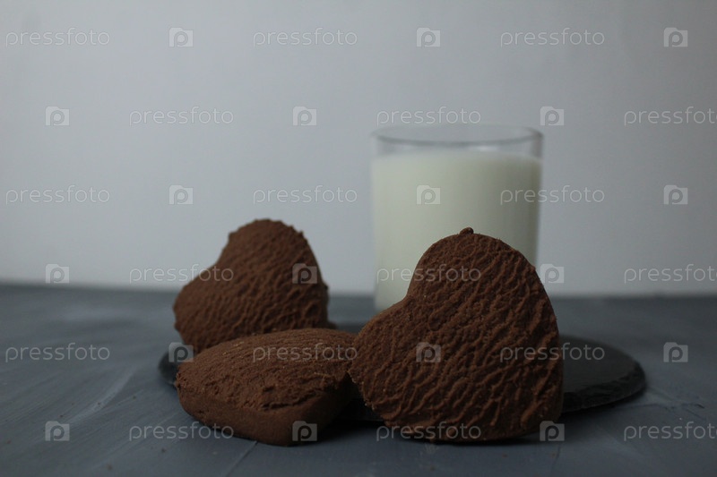Сердце печенье крупным планом с молоком на сером фоне День святого Валентина завтрак еда для праздника символ сердца. Красивое печенье
