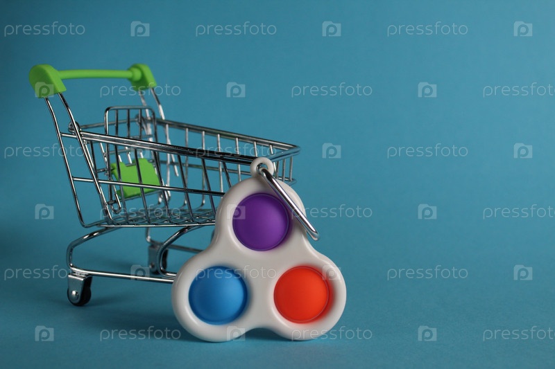 Игрушка антистресс попить простую ямочку возле магазина тележки на синем фоне с местом для текста и с копирайтом