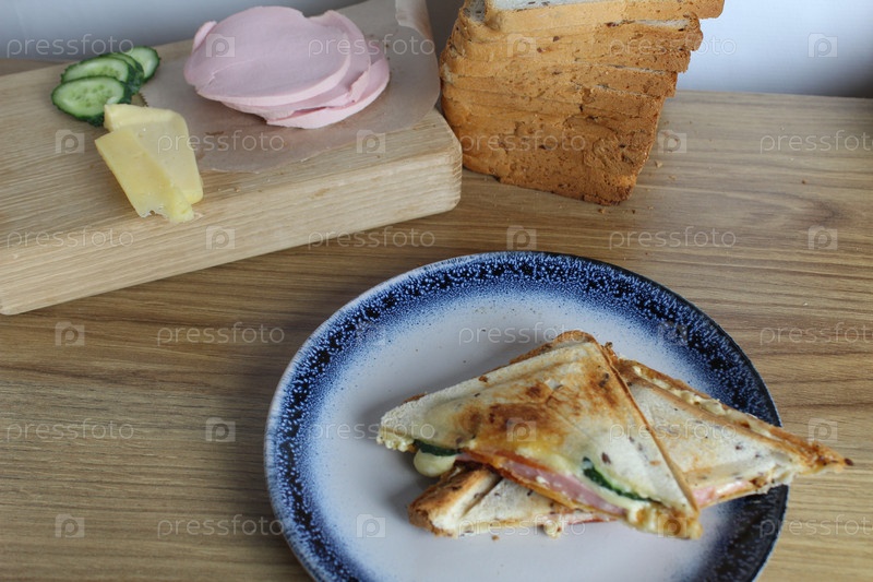 Сэндвич с ветчиной, сыром и овощной зеленью крупным планом на тарелке рядом с соком. Приготовление завтрака. Закуска