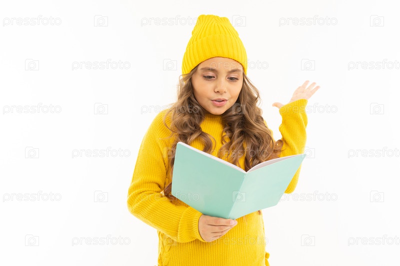 Счастливая кавказская девушка в желтой шляпе и капюшоне читает книгу на белом фоне